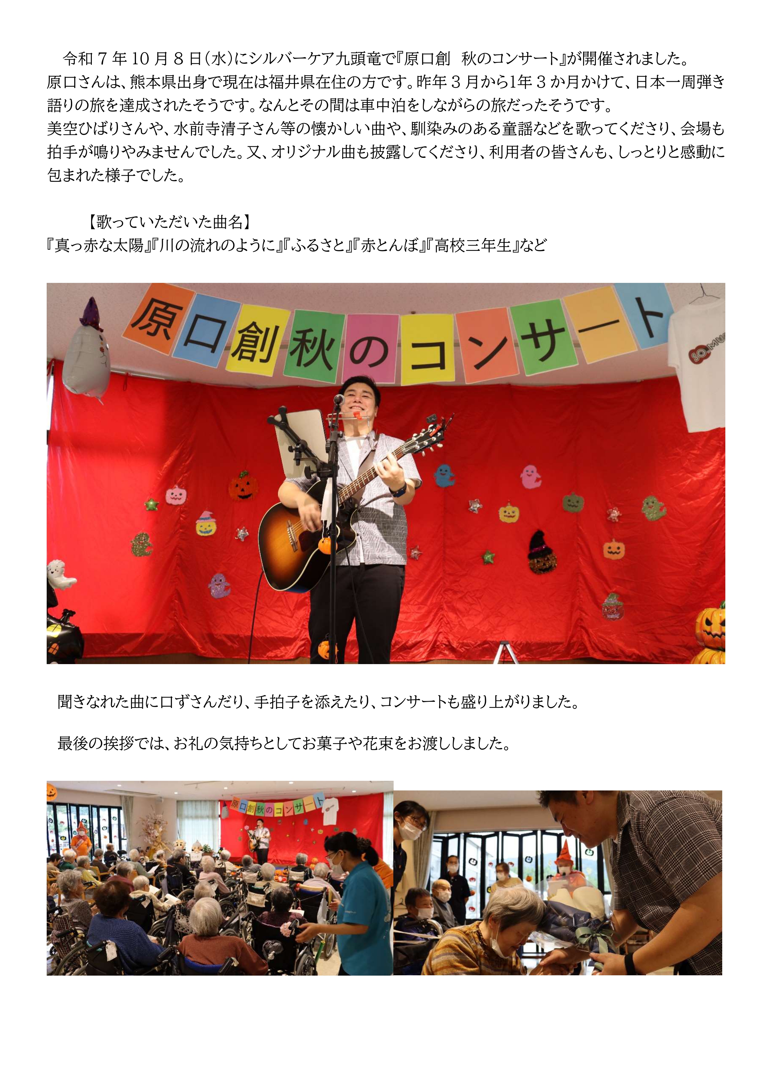シルバ―ケア九頭竜にて、原口創様 秋のコンサートを行いました。